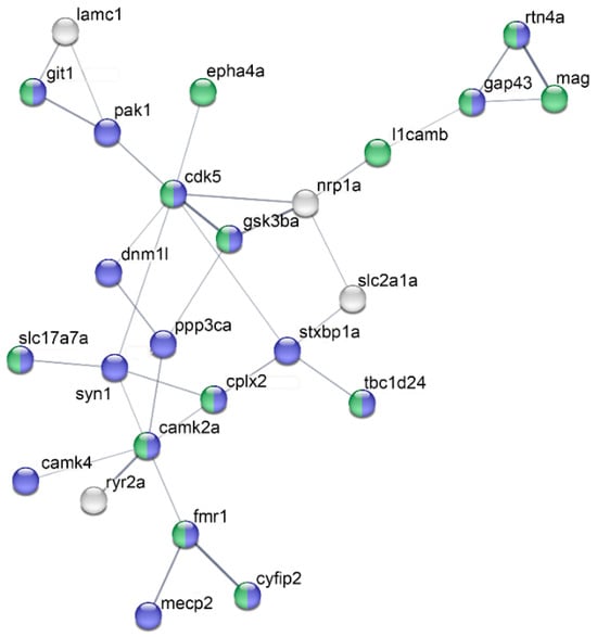 Protein association network analysis. The analysis was conducted using String for all the proteins listed in Table 2, employing a medium confidence threshold (0.4) for the minimum required interaction score. The thickness of the lines indicates the strength of the data support. For clarity, proteins not connected in the network are omitted. Following GO analysis, proteins involved in cell projection are indicated in green, while those related to synapse formation are depicted in blue.