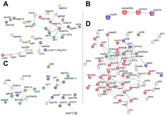 Protein association network analysis of 18 °C vs. 26 °C (A,B), 34 °C vs. 26 °C (C), and BDNF mutants (D). The analysis was conducted using String on the proteins listed in Table S12 with an occurrence ≥ 20%, using a medium confidence (0.4) for the minimum required interaction score. Line thickness indicates the strength of the data support. For clarity, the proteins not connected are not present in the figure. (A) 18 °C vs. 26 °C. Upon GO analysis, the proteins involved in neuron projections are indicated in blue, the proteins involved in synapse formation in green, proteins belonging to abnormal locomotory behaviour process quality are in red, and those to IL3 signalling pathways in yellow. (B) 18 °C vs. 26 °C, proteins of the “psychological disorder” category. Calcium signalling is indicated in red and the adaptive immune system network in blue. (C) 34 °C vs. 26 °C. In the figure, the following networks are indicated: synapse (green), regulation of cytoskeleton organization (blue), and establishment of cell polarity (red). (D) KO BDNF and HT BDNF at 26 °C and 34 °C vs. WT at the same temperature. In the figure the following networks are indicated: synapsis (red), stress response (blue), response to heat stress (green). Details on the timing of the observed alteration in specific protein abundance (chronic and/or acute) are reported in Table S12.