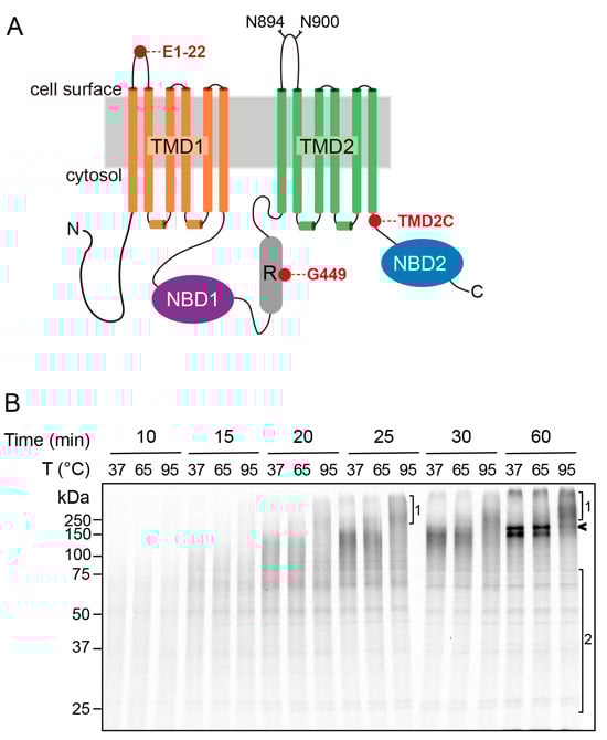 mRNA transcription was conducted as described [27], and mRNA was dissolved in 50 µL nuclease-free H2O containing 20 units of SUPERase. In RNAse inhibitor (Ambion, uden, The Netherlands) and stored at −80 °C. In vitro translation–translocation in the presence of semi-permeabilized HT1080 cells has been described [28,111]. In brief, 10 μL translation mix, which corresponds to one sample, contains 6.6 μL Flexi® rabbit reticulocyte lysate (Promega, Leiden, The Netherlands), 1 mM amino acid mix without methionine and cysteine, 50 mM KCl, 1 mM DTT, 2.1 μL freshly prepared semi-permeabilized HT1080 cells, 0.4 μL mRNA (~1 mg/mL), and 4 μCi 35S methionine and cysteine (10 μCi/μL, Redivue PRO-MIX L-[35S] (GE Healthcare, Chicago, IL, USA). Translation reactions were conducted at 30 °C for the indicated periods and terminated with 0.25 mL ice-cold 110 mM KOAc, 20 mM HEPES pH 7.2, 2 mM MgOAc2 (KHM) containing 1 mM cycloheximide. Reactions were transferred to ice, washed once (2 min at 10,000× g at 4 °C) with 0.75 mL ice-cold KHM, and resuspended in 20 μL KHM, 1% Triton X-100 (KHM lysis buffer). Lysates were then subjected (or not) to limited proteolysis (see below) and received an equal volume 2x reducing Laemmli sample buffer (final concentrations 200 mM Tris-HCl pH 6.8, 3% SDS, 10% glycerol, 1 mM EDTA, 0.004% bromophenol blue) and thermally denatured for indicated times and temperatures. For some experiments, full-length CFTR produced in vitro and proteolyzed peptides were immunoprecipitated before denaturation. Samples containing non-proteolyzed CFTR or limited proteolysis fragments were resolved on 7.5% and 12.5% SDS-PAA gels, respectively. Gels were analyzed on A Typhoon Imager and exposed to Kodak MR BioMax film.