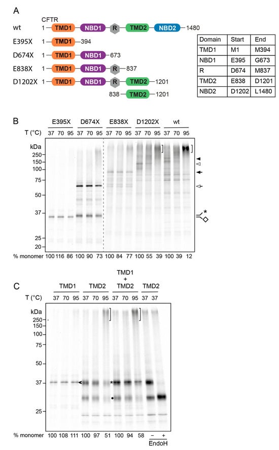 After in vitro translation in the presence of semi-permeabilized cell membranes, isolated TMD1 (E395X, arrowhead) and TMD2 (E838-D1201, asterisk, and filled circle) were solubilized and subjected to increasing temperatures. Consistent with our previous findings, incubation of samples at 95 °C reduced monomeric full-length TMD2 in the gel and increased the number of aggregates (Figure 2C, bracket), whereas TMD1 remained monomeric (Figure 2C, arrowhead). Glycosylated (Figure 2C, asterisk) and non-glycosylated TMD2 (Figure 2C, filled circle) aggregated to the same extent (Figure 2C, bracket) at 95 °C, indicating that glycosylation did not protect TMD2 against aggregation in these experimental conditions.