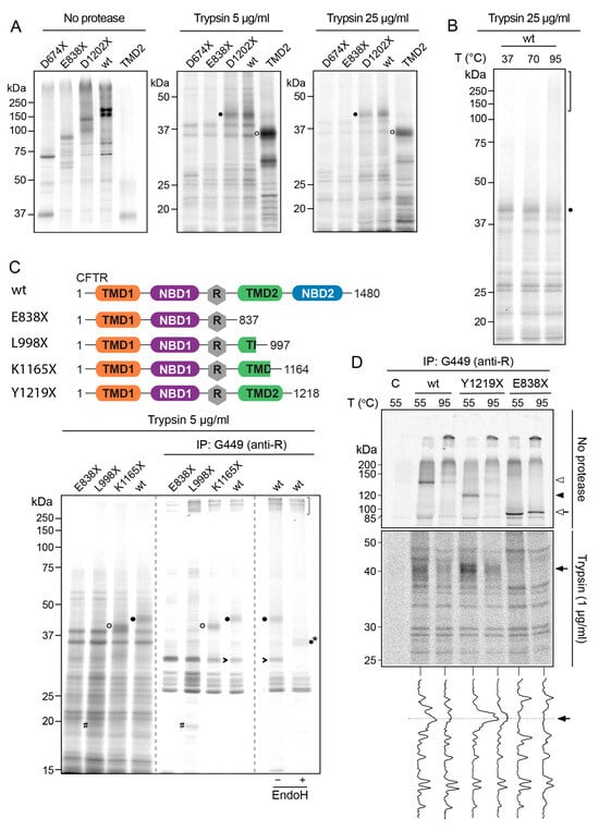 To determine whether the results can be extended beyond in vitro conditions, we analyzed the thermal aggregation of CFTR produced in the cellular context. HEK293T cells expressing wild-type CFTR or variants truncated after R (E838X) or TMD2 (Y1219X) were pulses labeled for 15 min with 35S-methionine/cysteine (Figure 3D). Detergent lysates were subjected to limited proteolysis with 1 µg/mL trypsin (or not) and full-length proteins (top panel) or proteolytic fragments, then were immunoprecipitated with the G449 antibody against R and resolved by SDS-PAGE. During this short period of labeling, negligible amounts of newly synthesized CFTR molecules have already traveled to the Golgi complex, and that is why only the oligomannose forms are visible for wild-type and Y1219X CFTR (top panel), both eventually transported to the Golgi complex [40,41]. Truncation after R creates a half-CFTR molecule that cannot assemble its domains and, therefore, does not fold properly [42] and gets retained in the ER. Consistent with the results of the in vitro experiments, raising the denaturation temperature to 95 °C decreased the amount of native wild-type and of Y1219X, the latter only lacking NBD2 (Figure 3D, upper panel). The truncation after R (E838X, without TMD2 and NBD2) showed little, if any, aggregation propensity at 95 °C (Figure 3D, upper panel). Since CFTR was more sensitive to trypsin in detergent lysates from cells than in in vitro translation reactions, we titrated the trypsin concentrations. Limited proteolysis with 1 µg/mL trypsin followed by immunoprecipitation with G449 also recapitulated the in vitro results (Figure 3A–C) and uncovered bands at ~42 kDa for wild-type CFTR and Y1219X, which were diminished when samples were denatured at 95 °C (Figure 3D, middle and bottom panels).