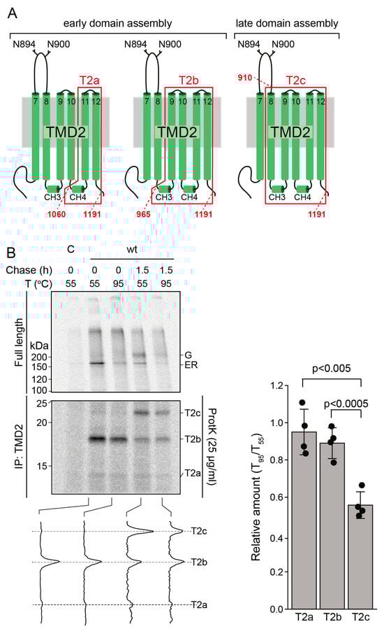 TM7 and TM8 constitute the main unstable determinant in CFTR. (A). Schematic representation highlighting the boundaries of the T2a,b, and c fragments generated by limited proteolysis with proteinase K from TMD2 in CFTR [26]. (B). HEK293T cells expressing full-length CFTR were pulse-labeled for 15 min and either lysed immediately or after a chase of 1.5 h. CFTR was immunoprecipitated with antibody E1-22 against TMD1 (top panel). The remaining lysates were subjected to limited proteolysis with 25 µg/mL proteinase K, and protease-resistant fragments were immunoprecipitated with TMD2C antibody (middle panel). Immunoprecipitates were heat denatured at 55 or 95 °C and resolved by 7.5% SDS-PAGE (top panel) or 12% SDS-PAGE (middle panel). The bottom panel represents the lane intensity profiles (ImageQuant analysis) of the middle panel. Ratios of T2a, T2b, and T2C at 95 °C versus 55 °C represent means ± SD of four experiments. Student’s t-test yielded the p values.