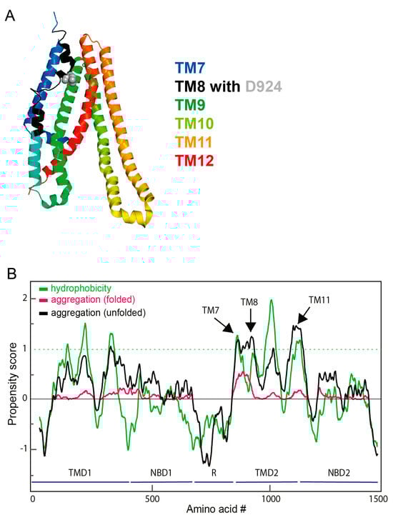 We next assessed aggregation propensity in silico [44]. Using the algorithm in combination with AlphaFold2.0 [47] and the cryo-EM structure of CFTR (PDB 5UAK) [43] confirmed that the major aggregate-prone parts are TM7 and TM8 (Figure 5B), with minor contributions of TM9-11 in the folded structure. In contrast, for TMD1, which has a comparable hydrophobicity profile as TMD2 (Figure 5B), only minor aggregation-prone regions are predicted for the folded state in accordance with the experimental data (Figure 2 and Figure 3). Since Alphafold predictions of unstructured regions have low confidence [48,49], we also computed aggregation propensity based on sequence alone and arrived at the same conclusion (not shown). Thus, theoretical and experimental data show that TM7 and TM8 form the aggregation-sensitive elements in CFTR).