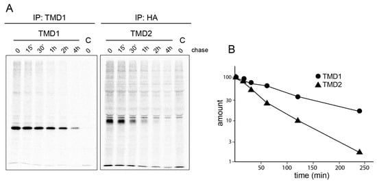 Having established that TMD2 and not TMD1 is the unstable domain in CFTR, we set out to assess whether this translated to the physiological context. To determine degradation kinetics in cells, we transiently expressed isolated TMD1 and TMD2 domains in HEK293T cells, radiolabeled these for 5 min, and chased them for different periods. The chase was conducted in the presence of 1 mM cycloheximide to stop protein synthesis after pulse labeling and synchronize the entry of full-length domains into the chase period. The TMD proteins were then immunoprecipitated from detergent lysates and analyzed by SDS-PAGE. To facilitate the detection of TMD2, we employed a TMD2 construct with a triple-HA tag in ECL4 as pioneered by the Lukacs lab [50]. A comparison of TMD1 and TMD2 turnover showed that TMD2 is degraded faster than TMD1 (Figure 6), in agreement with our earlier measurements [40]. These data show that the in vitro thermostability of TMD1 and TMD2 correlates well with their cellular stability, suggesting that aggregation-sensitive TMD2 is recognized by molecular chaperones as an unstable domain and triaged for ER-associated degradation.