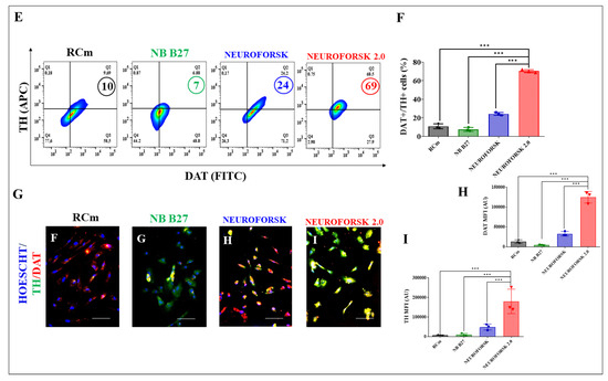 Previously, it has been shown that MenSC-derived DALNs obtained in NeuroForsk medium yielded 26% TH+ and DAT+ neurons assessed by flow cytometry [7]. We tested whether adding growth factors FGFb and BDNF, the hormone melatonin, and the purine derivative small-molecule purmorphamine to NeuroForsk medium, now called NeuroForsk 2.0 medium, might increase the production of mature DALNs. To achieve this, MenSCs were cultured in NeuroForsk medium and NeuroForsk 2.0 medium. For comparative purposes, cells were cultured in RCm and maintenance medium NB B27TM. Figure 1 shows that MenSCs cultured in RCm and NB B27TM medium expressed high basal percentages of neuronal lineage marker neurofilament light chain protein (NFL), a specific neuronal cytoskeleton protein, by 32% and 34%, respectively (Figure 1A,B). In contrast, MenSCs cultured in either NeuroForsk or NeuroForsk 2.0 medium expressed NFL marker (Figure 1A), albeit with different strength. The MenSC-derived DALNs increased the expression of NFL by +56%, whereas cells cultured in NeuroForsk 2.0 medium increased the expression of NFL by +147% in ChLNs compared to cells cultured in RCm (Figure 1A,B). Fluorescent microscopy analysis reproduced similar observations (Figure 1C,D). On the other hand, MenSC-derived DALNs expressed low basal levels of DAergic neuron markers TH and DAT in RCm and NB B27 TM medium (Figure 1E,F). While the percentage of DALNs, i.e., TH+/DAT+ cells increased by about +140% in NeuroForsk medium compared to RCm, the DALNs TH+/DAT+ cells increased by +590% in NeuroForsk 2.0 medium compared to RCm (Figure 1E,F). Of note, MenSCs cultured in NeuroForsk 2.0 medium increased DALNs TH+/DAT+ by +188% compared to MenSCs cultured in NeuroForsk medium. There was a statistically significant difference between RCm, NB B27TM, and NeuroForsk medium versus NeuroForsk 2.0 (Figure 1E). Similar observations were obtained by fluorescent microscopy (FM, Figure 1G–I).