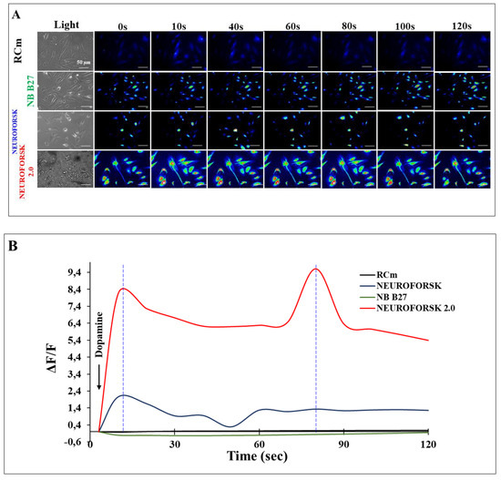 Evaluation of dopamine (DA) response in dopamine-like neurons (DALNs). (A) MenSCs were cultured in RCm, NB-B27, NeuroForsk and NeuroForsk 2.0 medium as described in Section 4. Time-lapse images (0, 10, 40, 60, 80, 100 and 120 s) of Ca2+ fluorescence in MenSC cultured in RCm, NB-B27, NeuroForsk, and NeuroForsk 2.0 medium at day 7 (n = 30 cells imaged, N = 3 dishes) as a response to dopamine (DA) treatment. DA was puffed into the culture at 0 s. Then, the Ca2+ fluorescence of cells was monitored at the indicated times. Color contrast indicates fluorescence intensity: dark blue < light blue < green < yellow < red. (B) Normalized mean fluorescence signal (ΔF/F) over time, indicating temporal cytoplasmic Ca2+ elevation in response to DA treatment. The figures represent 1 out of 3 independent experiments. Data are presented as mean (n = 3). Image magnification, 200×.