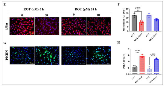 Given that the primary target of ROT is mitochondrial complex I [35], we initially evaluated the effect of acute and chronic ROT exposure on ΔΨm in MenSC-derived DALNs. Figure 3A shows that acute or chronic ROT exposure induces loss of ΔΨm in DALNs, albeit with different strengths. While ROT provoked a reduction in ΔΨm by 49% in acute conditions (Figure 3B), a moderate decrease in ΔΨm by 13% was observed in chronic conditions. Effectively, ROT (50 μM) exposure for 6 h induced an important reduction in ΔΨm by 50% in DALNs when compared to cells exposed to ROT (10 μM) for 24 h. We also wanted to evaluated whether ROT affects PRKN, a cytosolic ring-between-ring E3 ligase protein involved in mitochondria quality control and apoptosis [51]. As shown in Figure 3C, acute ROT exposure increased the expression of PRKN by 514% in DALNs, whereas chronic conditions induced much lower expression of PRKN (+363%, Figure 3C,D) compared to untreated cells. When compared to chronic conditions, the acute ROT exposure yielded +16% PRKN expression. Regarding fluorescent microscopy analysis, similar observations were obtained for ΔΨm (Figure 3E,F) and PRKN (Figure 3G,H) in DALNs.