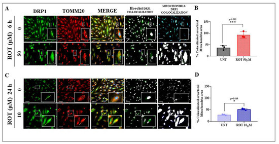 To further characterize the effect of ROT on mitochondria, we evaluated the cellular localization of the protein dynamin-related protein 1 (DRP1), which is implicated as a mediator of mitochondrial fission and apoptosis [41,42], via phosphorylation of LRRK2 [52]. Therefore, we assessed whether DRP1 colocalized with the translocase of the outer membrane of mitochondria 20 (TOMM20) was indicative of the cytoplasmic DRP1 translocation to mitochondria in DALNs under ROT treatment. As shown in Figure 4A, DRP1 displayed a cytoplasmic localization in untreated (0 μM condition) DALNs for 6 h, whereas it mostly colocalized with mitochondrial TOMM20 protein in DALNs (85%) when exposed to ROT (50 μM, acute conditions) (Merge and Figure 4B). Similarly, no colocalization of DRP1 and TOMM20 was observed in untreated DALNs cultured for 24 h (Figure 4C), but it colocalized with TOMM20 (50%) in DALNs when exposed to ROT (10 μM, chronic conditions). There was not only a significant difference between the untreated versus treated conditions on DALNs (Figure 4B or Figure 4D) but also a significant statistically difference between DALNs exposed to ROT (50 μM, 6 h) and ROT (10 μM, 24 h) in DALNs (Figure 4B,D, p = 0.003).