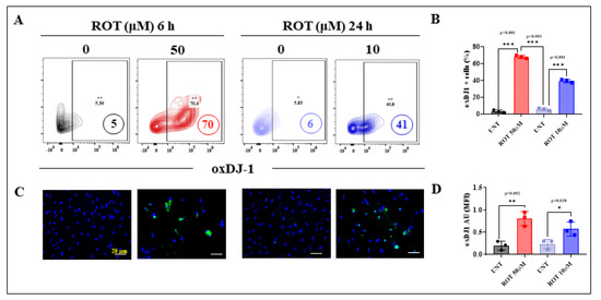 DALNs show a high oxidation of DJ-1 under acute but moderate under chronic ROT exposure. (A) Representative flow cytometry contour plots showing untreated DALNs or those treated with ROT (50 µM) for 6 h and untreated DALNs or those treated with ROT (10 µM) for 24 h, and stained with primary antibody against oxidized protein DJ-1 (DJ-1Cys106-SO3, oxDJ-1). (B) Percentage of DJ-1Cys106-SO3-positive cells. (C) Representative fluorescence microscopy photographs showing untreated DANLs or those treated with ROT (50 µM) for 6 h and untreated DANLs or those treated with ROT (10 µM) for 24 h and stained with Hoechst (blue) and primary antibodies against oxDJ-1 (green). Positive blue fluorescence reflects nuclei and positive green fluorescence reflects the presence of oxDJ-1. (D) Quantification of the oxDJ-1. The data are presented as the mean ± SD of three independent experiments (n = 3). One-way ANOVA followed by Tukey’s test: Statistically significant differences: * p < 0.05; ** p < 0.01, *** p < 0.001. Image magnification, 200×. +, ++ symbols and numbers in the figure represent positive cellular population for the tested marker.