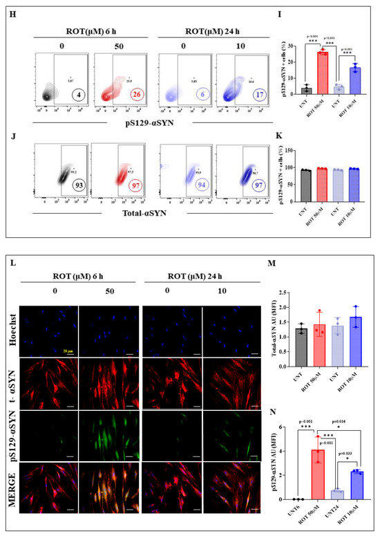 DALNs show a high oxidation of phosphorylation of LRRK2 and phosphorylation of α-Syn under acute but moderate under chronic ROT exposure. (A) Representative flow cytometry contour plots showing untreated DALNs or those treated with ROT (50 µM) for 6 h and untreated DALNs or those treated with ROT (10 µM) for 24 h, and stained with primary antibody against phosphorylated LRRK2 (pS935-LRRK2). (B) Percentage of pS935-LRRK2-positive cells. (C) Representative flow cytometry contour plots showing untreated DALNs or those treated with ROT (50 µM) for 6 h, and untreated DALNs or those treated with ROT (10 µM) for 24 h and stained with primary antibody against naïve LRRK2. (D) Percentage of LRRK2-positive cells. (E) Representative fluorescence microscopy photographs showing untreated DANLs or those treated with ROT (50 µM) for 6 h and untreated DANLs or those treated with ROT (10 µM) for 24 h and stained with Hoechst and primary antibodies against pS935-LRRK2 and naïve LRRK2. Positive blue fluorescence reflects nuclei, positive green fluorescence reflects the presence of pS935-LRRK2, and positive red fluorescence reflects t-LRRK2 protein. (F,G) Mean fluorescence intensity (MFI) in untreated or treated DANLs. (H) Representative flow cytometry contour plots showing untreated DALNs or those treated with ROT (50 µM) for 6 h and untreated DALNs or those treated with ROT (10 µM) for 24 h and stained with primary antibody against phosphorylated α-synuclein (pS129-αSYN). (I) Percentage of pS129-αSYN-positive cells. (J) Representative flow cytometry contour plots showing untreated DALNs or those treated with ROT (50 µM) for 6 h and untreated DALNs or those treated with ROT (10 µM) for 24 h and stained with primary antibody against naïve αSYN. (K) Percentage of total- αSYN-positive cells. (L) Representative fluorescence microscopy photographs showing untreated DANLs or those treated with ROT (50 µM) for 6 h and untreated DANLs or those treated with ROT (10 µM) for 24 h and stained with Hoechst and primary antibodies against pS129-αSYN and naïve αSYN. Positive blue fluorescence reflects nuclei, positive green fluorescence reflects the presence of pS129-αSYN, and positive red fluorescence reflects total αSYN protein. (M,N) Mean fluorescence intensity (MFI) in untreated or treated DANLs. The data are presented as the mean ± SD of three independent experiments (n = 3). One-way ANOVA followed by Tukey’s test. Statistically significant differences: * p < 0.05; *** p < 0.001. Image magnification, 200×. + symbol and numbers in the figure represent positive cellular population for the tested marker.