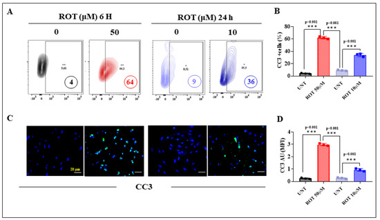DALNs show high-oxidation cleaved caspase 3 (CC3) under acute and chronic ROT exposure. (A) Representative flow cytometry contour plots showing untreated DALNs or those treated with ROT (50 µM) for 6 h and untreated DALNs or those treated with ROT (10 µM) for 24 h and stained with primary antibody against cleaved caspase-3 (CC3). (B) Percentage of CC3-positive cells. (C) Representative fluorescence microscopy photographs showing untreated DANLs or those treated with ROT (50 µM) for 6 h and untreated DANLs or those treated with ROT (10 µM) for 24 h and stained with Hoechst and primary antibodies against protein CC3 (green). Positive blue fluorescence reflects nuclei, positive green fluorescence reflects the presence of CC3 protein. (D) Mean fluorescence intensity (MFI) in untreated or treated DANLs. The data are presented as the mean ± SD of three independent experiments (n = 3). One-way ANOVA followed by Tukey’s test: Statistically significant differences: *** p < 0.001. Image magnification, 200×. +, ++ symbols and numbers in the figure represent positive cellular population for the tested marker.