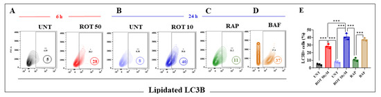 Next, we evaluated whether ROT-induced accumulation of autophagosomes and autolysosomes relied on dose or time of exposure in DALNs. Microtubule-associated protein 1B light chain 3II (LC3II), a standard marker for autophagosomes, is generated by the conjugation of cytosolic LC3I with phosphatidylethanolamine (PE) on the surface of nascent autophagosomes [57]. As LC3II is relatively specifically associated with autophagosomes and autolysosomes (=autophagosome + lysosome), quantification of lipidated LC3B-positive cells is considered a gold-standard assay for monitoring cell organelle autophagy [58]. Flow cytometry analysis shows that acute ROT exposure induced an important buildup of lipidated LC3B+ cells by +460% (Figure 8A) and chronic ROT exposure brought a lower accrual of LC3B+ by +400% (Figure 8B). However, chronic conditions expressed much more LC3B+ (+30%) compared to acute conditions. As expected, rapamycin (RAP), used as a standard inducer of autophagy, induced the accumulation of LC3B+ cells by 38% (Figure 8C), whereas bafilomycin (BAF), used as an inhibitor of autophagy, induced high expression of LC3B+ cells by 363% (Figure 8D,E).
