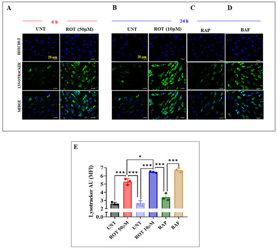 In addition to the above, we assessed whether acute or chronic ROT exposure induces the accumulation of lysosomes in DALNs. To achieve this aim, we used Lysotracker®, a cell-permeable, non-fixable, green fluorescent dye that stains acidic compartments within a cell, such as lysosomes. As shown in Figure 9, untreated DALNs showed basal acidic lysosome detection, i.e., lysotracker green-positive cells (Figure 9A, 2.56 AU and Figure 9B, 2.60 AU), whereas acute and chronic ROT exposure induced a statistically significant increase in lysosome detection by 104% Lysotrackers®+ cells (Figure 9A,E) and 146% Lysotrackers®+ cells (Figure 9B,E), respectively. The effect of the inducer of autophagy RAP was much lower (+27% Lysotrackers® + cells, Figure 9C,E) than the chronic conditions (at 24 h) in DALNs, but the inhibitor BAF induced a comparable increase (154% Lysotrackers®+ cells, Figure 9D,E) to the chronic conditions.