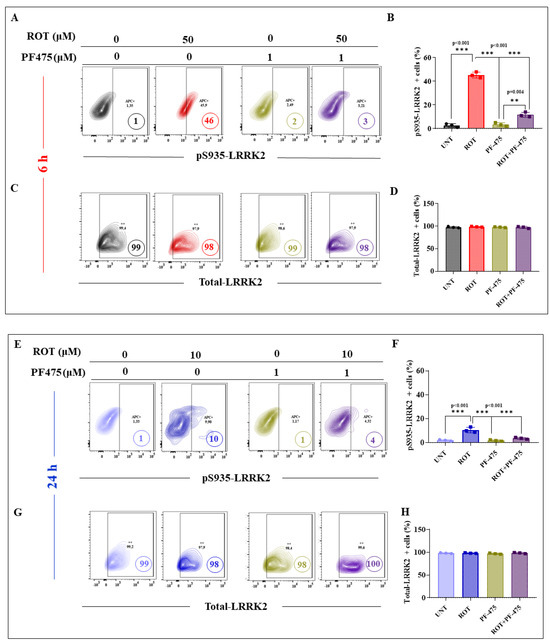 The inhibitor LRRK2 PF-06447475 (PF-475) inhibits pS935-LRKK2, and cleaved caspase 3 in DALNs treated with ROT. (A) Representative flow cytometry contour plots showing untreated DALNs or those treated with ROT (50 µM) in the absence or presence of PF-475 for 6 h, and stained with primary antibody against p-S935-LRKK2. (B) Percentage of p-S935-LRKK2-positive cells in untreated cells and cells treated with ROT and/or PF-475. (C) Representative flow cytometry contour plots showing untreated DALNs or those treated with ROT (10 µM) in the absence or presence of PF-475 for 6 h and stained with primary antibody against total-LRKK2. (D) Percentage of total LRKK2-positive cells in untreated cells and cells treated with ROT and/or PF475. (E) Representative flow cytometry contour plots showing untreated DALNs or those treated with ROT (10 µM) in the absence or presence of PF-475 for 24 h, and stained with primary antibody against p-S935-LRKK2; (F) Percentage of p-S935 LRKK2-positive cells in untreated cells and cells treated with ROT and/or PF-475. (G) Representative flow cytometry contour plots showing untreated DALNs or those treated with ROT (10 µM) in the absence or presence of PF-475 for 24 h and stained with primary antibody against total-LRKK2. (H) Percentage of total LRKK2-positive cells in untreated cells and cells treated with ROT and/or PF-475. (I) Representative flow cytometry contour plots showing untreated DALNs or those treated with ROT (50 µM) in the absence or presence of PF-475 for 6 h and stained with primary antibody against CC3; (J) Percentage of CC3-positive cells in untreated cells and cells treated with ROT and/or PF-475. (K) Representative flow cytometry contour plots showing untreated DALNs or those treated with ROT (10 µM) in the absence or presence of PF-475 for 24 h, and stained with primary antibody against CC3. (L) Percentage of CC3-positive cells in untreated cells and cells treated with ROT and/or PF-475. The data are presented as the mean ± SD of three independent experiments (n = 3). One-way ANOVA followed by Tukey’s test. Statistically significant differences: ** p < 0.01; *** p < 0.001. ++ symbol and numbers in the figure represent positive cellular population for the tested marker.
