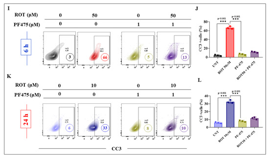 To evaluate the effect of the inhibitor LRRK2 PF-06447475 (PF-475) on apoptotic cell death in acute or chronic ROT exposure conditions, DALNs were left untreated or treated with ROT in the presence or absence of PF-475. We first verified that PF-475 inhibited the phosphorylation of LRRK2. Effectively, PF-475 almost completely blocked the p-S935-LRRK2 in DALNs treated with ROT (e.g., −93%) compared to cells treated with ROT only at 6 h (Figure 10A,B) without affecting total LRRK2 (100%, Figure 10C,D). Similar results were evidenced when cells were exposed to chronic conditions (−60%, Figure 10E–H). In parallel, analysis of CC3 showed that PF-475 reduced the percentage of CC3-positive cells by 80% and 70% in acute (Figure 10I,J) and chronic conditions (Figure 10K,L), respectively, compared to cells treated with 50 μM or 10 μM ROT only for 6 h or 24 h, respectively (Figure 10I–L).