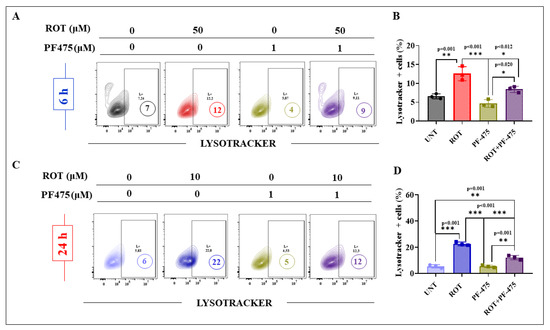 The inhibitor LRRK2 PF-06447475 (PF-475) affects the accumulation of lysosomes in DALNs treated with ROT. (A) Representative flow cytometry contour plots showing untreated DALNs or those treated with ROT (50 µM) in the absence or presence of PF-475 for 6 h and stained with Lysotracker®. (B) Percentage of Lysotracker® stain-positive cells in untreated cells and cells treated with ROT and/or PF-475. (C) Representative flow cytometry contour plots showing untreated DALNs or those treated with ROT (10 µM) in the absence or presence of PF-475 for 24 h, and stained with Lysotracker®. (D) Percentage of Lysotracker® stain-positive cells in untreated cells and cells treated with ROT and/or PF-475. The data are presented as the mean ± SD of three independent experiments (n = 3). One-way ANOVA followed by Tukey’s test. Statistically significant differences: * p < 0.05; ** p < 0.01; *** p < 0.001. L+ and numbers in the figure represent positive cellular population for the tested marker.