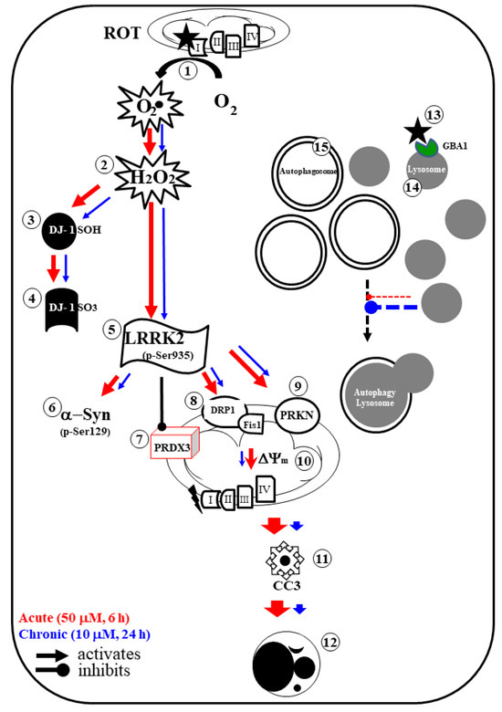 Schematic model of cell signaling induced by acute and chronic rotenone exposure in DALNs. Rotenone (ROT, black full star) binds to the ubiquinone binding site of mitochondrial complex I (NADH: ubiquinone oxidoreductase), thus preventing electron transfer via flavin mononucleotide (FMN) to coenzyme Q10 (1). Consequently, interruption of the electron transport chain concomitantly generates anion superoxide (O2−) and hydrogen peroxide (H2O2, 2). This last compound is capable of oxidizing the stress sensor protein DJ-1Cys106-SH (3) into DJ-1Cys106-SO3 (4) and directly activates LRRK2 (leucine-rich repeat kinase 2) kinase by autophosphorylation (5). Once LRRK2 is phosphorylated at Ser935, the active p-(S-935)-LRRK2 kinase phosphorylates three major targets: (i) alpha-synuclein (α-Syn) at residue Ser129 (6), (ii) it inactivates protein peroxiredoxin 3 (PRDX3, 7), thus preventing H2O2 catalysis [83]; (iii) p-(S-935)-LRRK2 activates the mitochondrial fission protein DLP-1 (dynamin-like protein 1, 8), which, together with the fission protein-1 (Fis-1) receptor, induces an increase in the expression of parkin (PRKN, 9), loss of mitochondrial potential (ΔΨm), fragmentation, and aggregation (10). Subsequently, the release of apoptogenic proteins (e.g., cytochrome C) results in the production of cleaved caspase 3 (11), which is responsible for chromatin condensation and DNA fragmentation (12), characteristics typical of apoptosis in DALNs. Alternatively, as shown previously, ROT binds and reduced the enzyme glucosylceramidase beta 1 (GBA1) (13). Moreover, the reduced catalytic activity of GCase results in a limited fusion of autophagosomes (14) and lysosomes (15), leading to their respective accumulation. Acute conditions: ROT 50 μM, 6 h (red arrow); chronic conditions: ROT 10 μM, 24 h (blue arrow). Arrow: activates; round pointed arrow: inhibits.