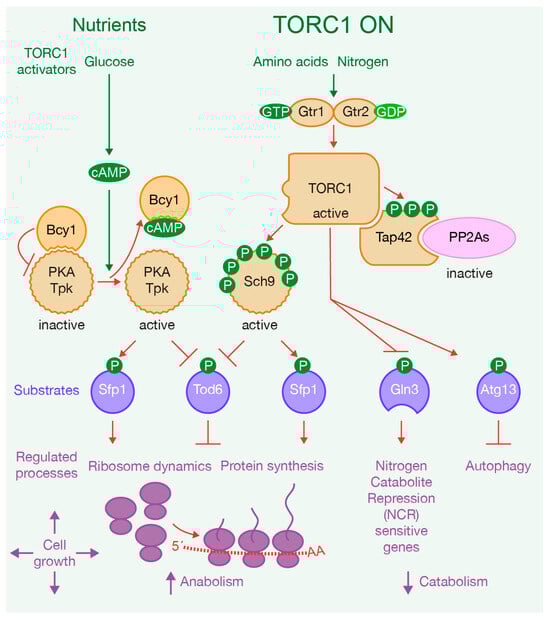 In both yeast and mammals, TORC1 couples environmental signals, including nutrients availability, growth factors and hormones, to cellular growth by triggering anabolic processes such as ribosome dynamics, protein synthesis and metabolic pathways. These processes include ribosomal protein expression, ribosomal RNA synthesis, ribosome biogenesis, activation of dormant ribosomes, translation and transcription, as well as nucleotide and lipid synthesis. Simultaneously, TORC1 suppresses catabolic processes like autophagy [3,4,12,15,21,22,23,24,25,26,27,28]. Nutrients play a significant role as activators of TORC1 since they have the capacity to trigger TORC1 activation and, consequently, cell growth [3] (Figure 1). In yeast cells, the presence of glucose, amino acids and other nitrogen sources induces TORC1 activation, while the absence of these nutrients inhibits TORC1. Specifically, amino acids activate TORC1 through the small GTPases Gtr1 and Gtr2 (Figure 1), which are orthologs of the mammalian Rag GTPases. When amino acids are sufficient, Gtr1 is in an active conformation, loaded with GTP, while Gtr2 is loaded with GDP [3] (Figure 1). Glucose starvation, conversely, induces AMP-activated protein kinase (AMPK Snf1), which promotes TORC1 disassembly and the translocation of Kog1 to a single body, leading to a reduction in TORC1 functionality. The phosphorylation of Kog1 in a Snf1-dependent manner drives these changes [29,30] (Figure 2). Notably, Snf1 also regulates Pib2, a protein that binds to phosphatidylinositol-3-phosphate (PI3P) and to Kog1. Snf1 phosphorylates Pib2, weakening its association with Kog1 [31]. In coordination, Snf1 phosphorylates Sch9, a downstream effector of TORC1 (Figure 1 and Figure 2). This phosphorylation has an inhibitory effect on TORC1’s ability to phosphorylate and activate Sch9 [31]. Additionally, glucose activates cAMP-dependent protein kinase (PKA), which drives biological responses similar to TORC1 (Figure 1). The TORC1 pathway closely interacts with the PKA pathway to regulate ribosome dynamics and protein synthesis [32,33,34,35] (Figure 1). The PKA pathway is primarily activated by glucose and other fermentable sugars, and is required for most of the cells’ transcriptional responses to glucose [34]. When cells are exposed to glucose, they activate adenylate cyclase, leading to an increase in cAMP production. This cAMP binds to the regulatory subunit of PKA, Bcy1, which inhibits the activity of PKA’s catalytic subunit (Tpk1, 2, or 3). The binding of cAMP to Bcy1 promotes its dissociation from the catalytic subunit, thereby activating PKA [34] (Figure 1). Lastly, nitrogen sources activate TORC1 via glutamine synthesis, and consistently with this, blocking glutamine synthesis decreases TORC1 activity [36] (Figure 1). Nutrient deprivation or treatment with rapamycin inhibits TORC1 activity, ultimately inducing cellular quiescence [37].