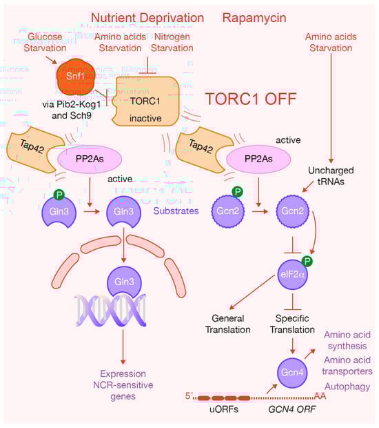 In addition to its major effectors, TORC1 has also been shown to phosphorylate other substrates directly. For instance, it phosphorylates Gln3, a transcription activator responsible for driving the expression of nitrogen catabolite repression (NCR) sensitive genes [46] (Figure 1). In nitrogen-rich conditions, Gln3 remains in the cytoplasm, preventing NCR-sensitive genes’ transcription (Figure 1). Conversely, in a nitrogen-limiting environment, Gln3 becomes activated as PP2As dephosphorylate it, causing Gln3 to relocate to the nucleus [47,48] (Figure 2). Recent research has found that the interaction between TORC1 and Gln3 is more intricate than previously understood [49]. Specifically, the C-terminal region of Gln3 is required for both its cytoplasmic retention and its rapamycin-dependent nuclear localization (Figure 2). Moreover, it has been determined that TORC1 interacts with the N-terminal region of Gln3, also playing a positive role in the regulation of Gln3 function [49].
