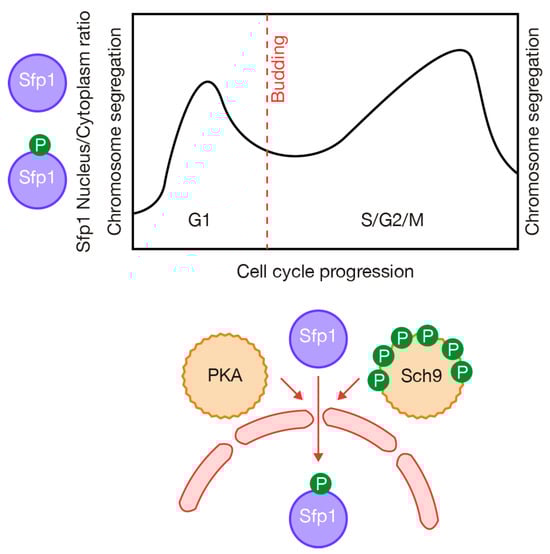 Interestingly, by monitoring Sfp1 and Tod6 as reporters, Guerra and colleagues found that the activities of the TORC1 and PKA pathways fluctuate throughout the cell cycle, even under constant external condition [55] (Figure 3). TORC1 and PKA activities peak during the G1 phase, followed by a decrease around the time of budding. Subsequently, the activity increases during S, G2 and early mitosis followed by a decrease in late mitosis [55] (Figure 3). The importance of TORC1 during G1 was initially demonstrated as rapamycin inhibits translation initiation and protein synthesis, which promotes an arrest at the G1 phase of the cell cycle [56]. Moreover, the TORC1 and PKA cascades also converge at the Rim15 kinase to control entry into G0 [57], as detailed below. Similar findings to those of Guerra and coworkers were identified using single-cell experiments to investigate metabolic activity or amino acid synthesis [58,59].