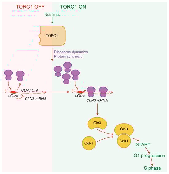 TORC1 promotes accumulation of Cln3-Cdk1 complexes, driving G1 progression. TORC1 regulates proteins involved in ribosome dynamics and protein synthesis, contributing to an increase in Cln3 protein levels that form complexes with Cdk1. Translation of CLN3 is controlled by an upstream open reading frame (uORF), which inhibits efficient translation under nutrient-limited conditions when ribosome availability is reduced. The presence of rapamycin and nutrient starvation blocks kinase activity associated with TORC1.