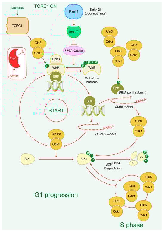 In budding yeast, the G1 cyclin Cln3 drives the progression through the G1 phase of the cell cycle, enabling cells to reach a critical point known as START in yeast and Restriction Point in mammalian cells. This point marks a no-return stage, after which cells are committed to continuing their cell division cycle. During G1, cells grow and an increase in Cln3-Cdk complexes stimulates the expression of the G1/S cluster, facilitating entry into S-phase. This process depends on both cell growth and cell size [87,88,89]. Cln3 protein levels increase gradually throughout the G1 phase, peaking around the time of bud emergence, close to the onset of S-phase [90,91]. Passage through START is regulated by nutrient availability, ensuring that cells have the necessary resources to complete the cell cycle. The presence of fermentable carbon and nitrogen sources, which activate TORC1 function (Figure 1), is essential for achieving the highest induction of CLN3 mRNA levels [92] (Figure 4). Notably, the inactivation of TORC1 leads to the downregulation of G1 cyclins and subsequently results in a G1 arrest [56,93].