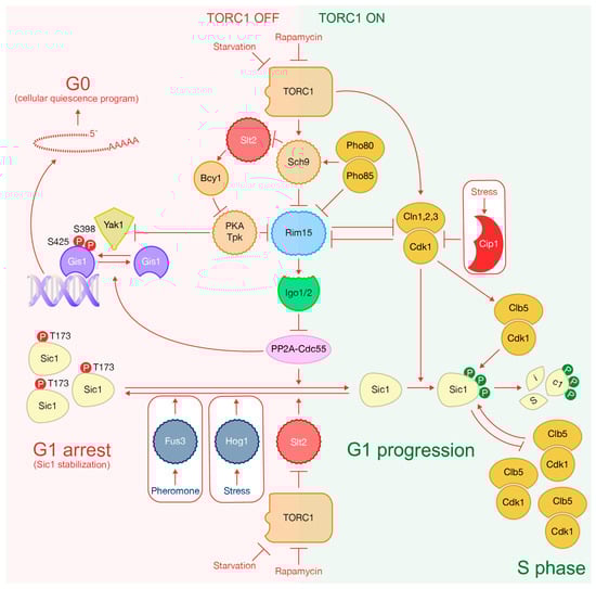 A reduction in TORC1 signaling, induced by carbon or nitrogen limitations, leads to G1 arrest and entry into quiescence [37,138] (Figure 6). This arrest is prompted by the decrease in CDK activity and the accumulation of Sic1 phosphorylated at the C-terminus as described above (Figure 6). On the other hand, the inactivation of TORC1 blocks the function of phosphatase PP2ACdc55, preventing the dephosphorylation of pT173 within Sic1, which precludes its own degradation via the proteasome (Figure 6). As a result, Sic1 is stabilized, which leads to a cell cycle arrest at the G1 phase [133] (Figure 6). Therefore, TORC1 clearly coordinates G1 progression with nutrient availability. That TORC1-regulated pathway is the analogous to the greatwall kinase in Xenopus, the yeast protein kinase Rim15 that phosphorylates endosulfines (Igo1/2) to directly inhibit the PP2ACdc55 [139,140] (Figure 6). Functional depletion of TORC1 by rapamycin addition induces rapid changes in the Rim15 phosphorylation profile, and, subsequently, the nuclear accumulation of Rim15 and Rim15-dependent transcription. TORC1 indirectly elicits Rim15 phosphorylation to promote its interaction with 14-3-3 proteins Bmh1/2, which blocks Rim15 nuclear entry. Simultaneously, TORC1 effector protein kinase Sch9 directly phosphorylates Rim15 to promote nuclear exclusion of Rim15 [57,141] (Figure 6). Additionally, nutrient limitation downregulates PKA, which releases Rim15 inhibition and drives cells into G0 in a similar way as occurs after the addition of rapamycin [142] (Figure 6). TORC1 signaling also positively regulates PKA via Sch9, which phosphorylates and inhibits Slt2. Subsequently, Slt2 is unable to phosphorylate and activate Bcy1, the negative regulatory subunit of PKA, which limits the activity of Bcy1 [21,143] (Figure 1 and Figure 6). Additionally, phosphate starvation drives entry into G0, which is controlled by the kinase activity associated with complexes formed by cyclin Pho80 and CDK Pho85. These complexes directly phosphorylate Sch9, preparing this kinase for subsequent phosphorylation by TORC1 [144] (Figure 6). Furthermore, Pho80/Pho85 complexes also phosphorylate Rim15 on the same residue as TORC1, promoting the accumulation of Rim15 in the cytoplasm where it is unable to activate gene expression to determine entry into quiescence [145,146] (Figure 6). Therefore, Rim15 is the key factor that integrates signals from TORC1, PKA and Pho80/Pho85 cascades, which explains how nutrient availability controls cell cycle progression (Figure 6). Interestingly, Cln1,2,3-Cdk1 negatively regulate Rim15 in cooperation with TORC1 by stimulating Rim15 localization in the cytoplasm, which contributes to the passage through START in proliferating cells [116,134] (Figure 6).