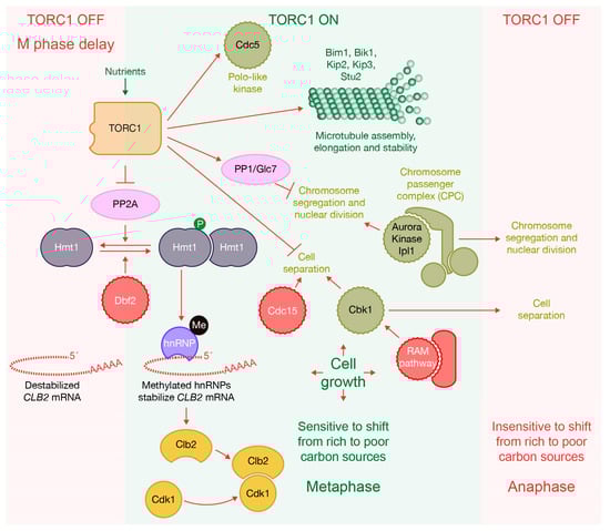 To counteract Hmt1 activity and induce the decay of CLB2 mRNA, the catalytic subunit of the PP2A phosphatase, Pph22, promotes Hmt1 dephosphorylation [152]. Consequently, the balance between the functions of Dbf2 and Pph22 regulates the entry into mitosis (Figure 7). The timing of chromosome segregation is delayed following the addition of rapamycin or the inactivation of components of TORC1 in budding yeast [153], which shows again a connection between the machinery that promotes cell cycle progression and the environmental conditions (Figure 7). When TORC1 is inhibited by rapamycin or during starvation, it triggers the recruitment of Pph22 to Hmt1. Subsequently, Hmt1 undergoes dephosphorylation, leading to the dissociation of Dbf2 from Hmt1. As a result, Hmt1 becomes inactive, preventing the methylation of hnRNPs and ultimately avoiding the accumulation of CLB2 mRNA in mitosis [152] (Figure 7).