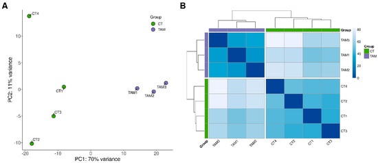 The sequencing data from the current study were submitted to the BioProject database under accession number PRJNA640997. After removing reads containing adapters and low-quality reads, the remaining high-quality reads were mapped to the Ensembl rat genome (mRatBN7.2; Ensembl release 107). The number of reads aligned to the reference genome ranged from 34.8 to 38.1 million per sample, and an average of 95.4% of the reads were mapped to unique locations. The total number of genes expressed in the ovaries of tumor-bearing rats of all examined samples ranged from 19,805 to 20,231 (Table S2). The results of both the principal component analysis (PCA) and the analysis of distance matrices revealed a high level of similarity between the biological replicates within the control and TAM-treated rat groups (Figure 1).