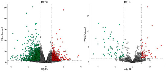 The volcano plot presenting differentially expressed genes (DEGs; p−adjusted ≤ 0.05 and log2FC ≥ 1.0 or log2FC ≤ −1.0) and lncRNAs (DELs; p−adjusted ≤ 0.05 and log2FC ≥ 1.0 or log2FC ≤ −1.0) in the ovaries of TAM−treated rats vs. untreated rats. DELs and DEGs are represented by multicolored circles, where red color is up−regulated DELs/DEGs and green down−regulated DELs/DEGs. Gray circles represent all lncRNAs or genes identified in the ovaries with no significant changes.