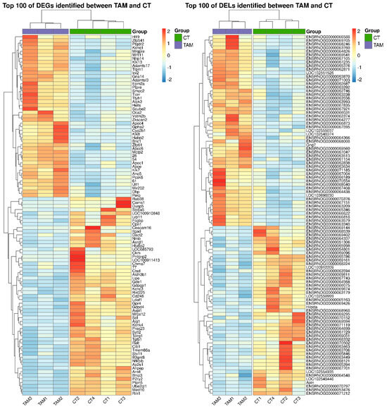 Heatmap of the top 100 differentially expressed genes (DEGs; p−adjusted ≤ 0.05 and log2FC ≥ 1.0 or log2FC ≤ −1.0) and lncRNAs (DELs; p−adjusted ≤ 0.05 and log2FC ≥ 1.0 or log2FC ≤ −1.0) demonstrated in the ovaries of rats treated with TAM. The expression values are presented as Z−score calculated from raw counts for each sample. The color scale of the heatmap shows the expression level where red blocks represent up− and pale blue blocks down−regulated genes or lncRNAs.