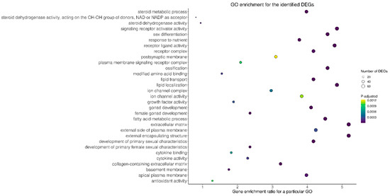 Gene Ontology (GO) analysis of DEGs identified in the ovaries of rats treated with TAM. The x-axis represents genes ratio enriched for a particular GO term, while the y-axis the names of particular GO terms. The size of the circle denotes the number of DEGs in the term and the circle color represents the range of log10 (p-adjusted + 1).