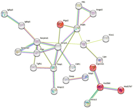 The “multi-organism reproductive process” category is closely related to ovarian function and was one of the enriched GO terms containing 49 DEGs (Table S4). Functional classification of these genes performed with the use of STRING (v11.5) produced a gene interaction network with 49 nodes and 28 edges (protein–protein interaction [PPI] enrichment p-value: 1.0 × 10−16; Figure 5). Nodes devoid of any interactions were deleted from the network. The created network includes genes related to ovarian steroidogenesis (Akr1c3, Ptgs2, CYP11a1, Hsd3b6, Hsd17b7) and cellular response to follicle-stimulating hormone stimulus (CYP11a1, Serpine 1, Akr1c3). We also identified a group of DEGs shown to be associated with apoptosis (e.g., Igfbp3, Serpine 1, Akr1c3, Angpt2, Vegfa, Ptgs2, Lep, Cdh1, Timp1, Tgfb1) (Figure 5, Table S4).