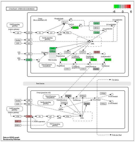 The KEGG database was used to classify the identified DEGs (p-adjusted < 0.05) by function, particularly as related to ovarian steroidogenesis—one of the most important aspects of ovarian physiology. Within this pathway, we identified four genes with expression up-regulated after TAM treatment (17β-HSD, Hsd17b2, Fshr and BMP-15) and 13 genes with expression down-regulated (Figure 6, Table S5).