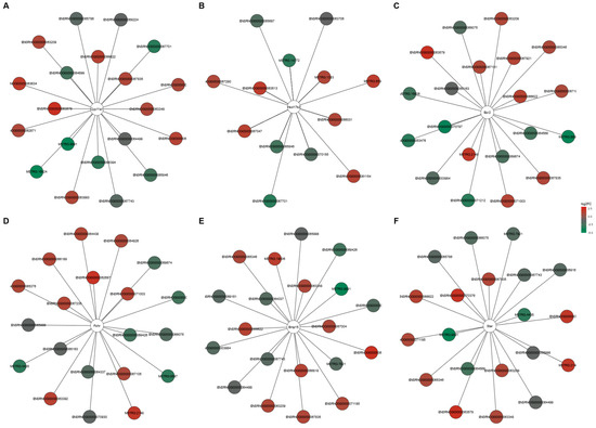 DELs and DEGs co–expression network analysis. Top 10 positive and negative correlations of DELs with the six selected DEGs (A–F) related to steroid hormone synthesis and metabolism (Pearson correlation coefficient > 0.99). Red nodes and green nodes represent the significantly up–regulated and down–regulated DELs in the ovaries of tumor–bearing rats treated with tamoxifen.