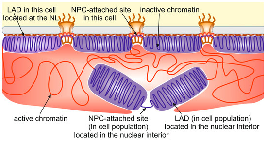 Many LADs identified in cell populations are located in the nuclear interior. The schematic shows the localization of some LADs (violet) and NPC-attached sites distantly from the NL (brown) and NPCs, respectively. Active chromatin is indicated by red.