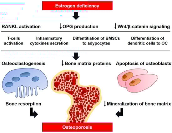 In fact, estrogen deficiency is a crucial factor in triggering the cascade of inflammatory mechanisms in the pathogenesis of osteoporosis, as described in the first section of the review. Estrogen deficiency causes the activation of RANKL signaling, resulting in increased production of inflammatory cytokines by activation of immune cells, including T-lymphocytes, that leads to osteoclastogenesis []. In this regard, the research of the RANKL/RANK/OPG system is a key scope of osteoimmunology [,].