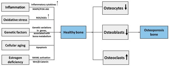 Osteoporosis is a degenerative systemic disease of the skeleton, characterized by a decrease in bone mass and an imbalance in the microarchitecture of bone tissue, which causes increased bone fragility and, accordingly, osteoporotic fractures []. Currently, with an increase in life expectancy, osteoporosis is considered one of the major health problems, leading to unbearable pain, the risk of bone fractures, and even death, which determines the high socio-economic significance of this disease []. According to the latest data, more than 200 million people in the world suffer from osteoporosis, and one in three women over the age of 50 years and one in five men have experienced osteoporotic fractures during their lifetime []. The main factors leading to the development of osteoporosis include both general factors associated with the natural processes of aging and activation of bone tissue resorption due to deficiency of sex hormones, as well as decreased osteogenesis and microarchitecture disorders due to various external factors, for example, with the administration of glucocorticoids []. Experimental and clinical studies devoted to investigating the main pathogenetic mechanisms of osteoporosis development revealed the important role of estrogen deficiency, inflammation, oxidative stress, cellular senescence, and epigenetic factors. The search of articles in PubMed up to September 2023 was conducted to describe the basic mechanisms of the development of osteoporosis at the molecular and cellular levels and to elucidate the most promising therapeutic strategies for the pathogenetic therapy of osteoporosis.