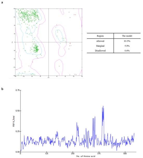 Ramachandran plot (a) and probability density function (PDF) total energy plot (b) for the selected homology model. In the Ramachandran plot, areas within the blue line are the favored regions, and areas within the purple line are the allowed regions. The red circle, triangle, and square are generously allowed or disallowed amino acid structures.