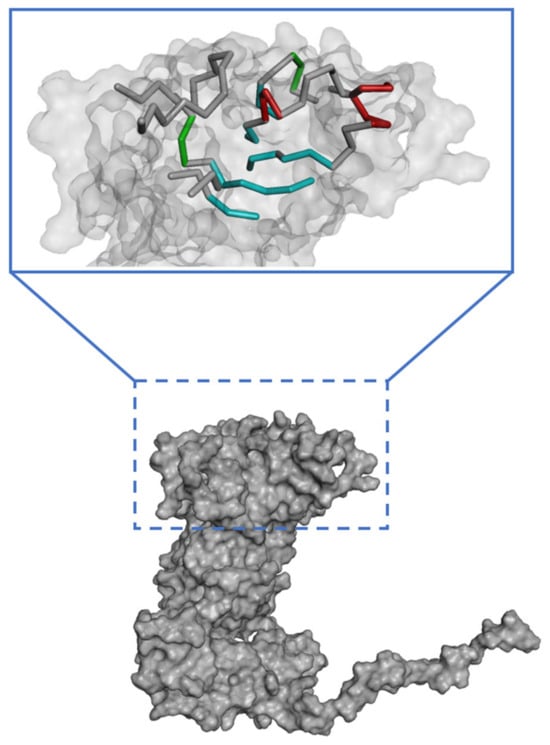 The binding site spheres of the capsid homology model were explored using an automated “receptor cavities” protocol, which predicts candidate binding sites based on the empty spaces in the structure of the protein. The spheres of the identified candidate binding sites are shown in Figure S5. According to a previous report of the structural characteristics of feline calicivirus, the residues I430, D434, and N495 of the capsid protein are in contact with feline junctional adhesion molecule A, a target molecule for cell entry [14]. Thus, the site comprising I430, D434, and N495 was identified as the most important binding site in the capsid homology model (Figure 3). The putative binding site of the walrus calicivirus capsid protein, as predicted in the generated homology model, comprised the following amino acids: A248, S429, E430, N431, K432, Q433, Y434, L435, A461, T462, M463, T464, N465, G466, K467, Y468, S469, Y470, T471, V472, Q473, S485, N486, E487, T488, H489, F490, K491, G492, F493, Y494, I495, M496, G497, N498, G510, N511, D512, A513, E514, L515, Q516, Q517, T518, S519, V520, T521, L522, F523, A524, F546, L547, Y548, N549, A550, D551, N552, R553, A554, T555, M556, S557, K558, T559, L569, G570, Y571, V572, L573, G613, Y614, and F615 (Figure 4). The binding site is located similarly to the outer VP1 surface of FCV, the region of interaction with fJAM-A.