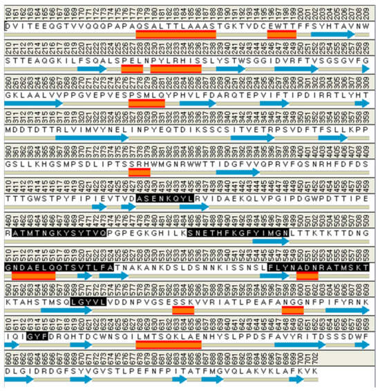 The amino acid composition of the active site in the walrus calicivirus capsid protein homology model (expressed in black). The orange rectangles are alpha helix, and the blue arrows are beta sheet structure.