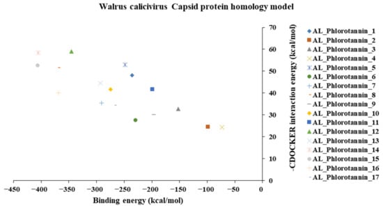A 2D chart of the docking conformations of phlorotannins in the walrus calicivirus capsid protein homology model. The interactions are expressed as CHARMM-based DOCKER (CDOCKER) interaction energy (kcal/mol) and binding energy (kcal/mol).