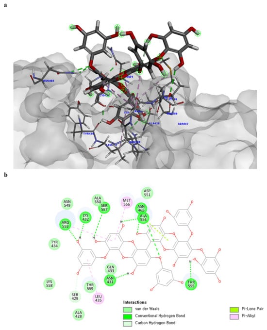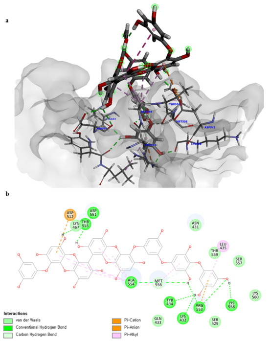 Of note, PH14 and PH15 showcased the most stable association with the capsid homology model. Although PH14 had a relatively low –CDOCKER energy (3.4846 kcal/mol) owing to its high ligand energy (125.346 kcal/mol), PH14 strongly docked to the capsid homology model with a –CDOCKER interaction energy of 58.4701 kcal/mol and a binding energy of −405.571 kcal/mol (Table S3, Figure 6 and Figure S6a,b). Similarly, PH15 also strongly interacted with the capsid homology model with a –CDOCKER interaction energy of 52.5371 kcal/mol and a binding energy of −406.115 kcal/mol (Table S3, Figure 7 and Figure S6c,d). Both PH14 and PH15 docked in close proximity to the active site of the capsid homology model, displaying favorable hydrogen bond interactions. As shown in the 3D and 2D interaction diagrams of the PH14–capsid protein complex, PH14 interacted in an intricate manner with various amino acids, including S429, N431, K432, L435, N465, R553, A554, T555, M556, and S557. The first, second, and fifth benzene rings of PH14 interacted via four pi bonds with L435, R553, M556, and N465. In addition, the four oxygen atoms in PH14 interacted via hydrogen bonds with S429, R553, N465, and A554 (Figure 6 and Table S4). Regarding PH15, the compound formed 9 pi bonds and 11 hydrogen bonds with various amino acids, including L435 (eight benzene ring), D 512 (second benzene ring), R553 (eight benzene ring), A554 (second, third, and forth benzene ring), and MET556 (seventh benzene ring) (Figure 7 and Table S5). These interactions imply that these phlorotannins can bind stably to the capsid homology model.