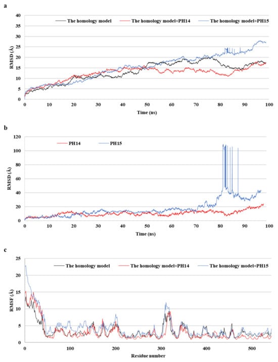 To generate a realistic model of protein dynamic conformational changes, the model was optimized via a 100 ns molecular dynamics (MD) simulation (Figure 1). The MD simulations mimic the physical motion of atoms in protein molecules in a natural environment. Therefore, an MD simulation of the generated homology model was necessary for resolving the structural deficiency of the initially generated structure [31,32]. The total energy of the model remained unchanged for a duration of 30 ns, specifically during the 70–100 ns period (Figure 1a); the result indicated that the model formed a stable conformation after these simulations.
