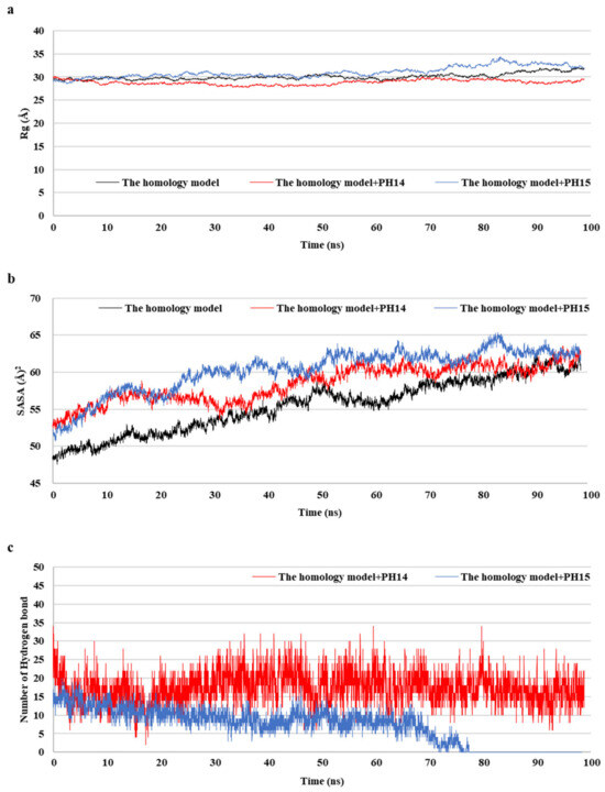 Radius of gyration (Rg) (a), solvent-accessible surface area (SASA) (b), and number of hydrogen bond (c) of the post-MD structure of the complexes during MD simulation.