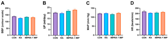 The thickness of urothelium was comparable in all examined groups. There was no significant effect of RA and IMP on bladder blood flow (BBF) and urine production (UP). In addition, assessment of cardiovascular function showed no significant effect of RA and IMP on arterial pressure (MAP) and heart rate (HR) (Figure 1).