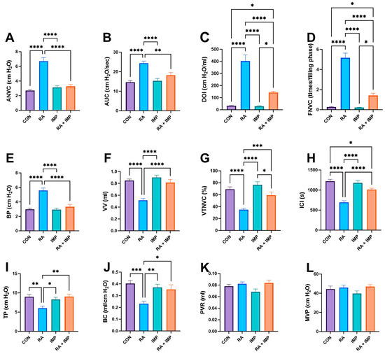 Effect of imperatorin on conscious cystometry parameters in the retinyl acetate-induced overactive bladder rat model. (A) nonvoiding contraction amplitude; (B) area under the pressure curve; (C) detrusor overactivity index; (D) nonvoiding contraction frequency; (E) basal pressure; (F) voided volume; (G) volume threshold to elicit nonvoiding contractions (NVC); (H) intercontraction interval; (I) threshold pressure; (J) bladder compliance; (K) post-void residual; (L) micturition voiding pressure. Data presented as means ± SEM. * p < 0.05, ** p < 0.01, *** p < 0.001, **** p < 0.0001.