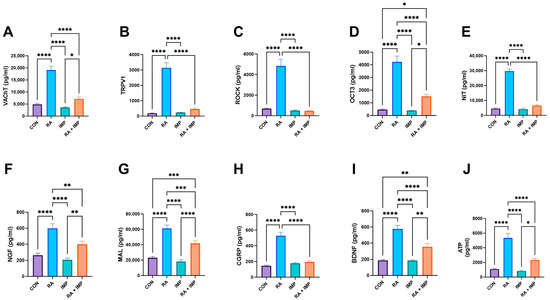 Interestingly, similar observations were made in the biochemical analysis performed. RA exerted a potent effect by significantly increasing the levels of VAChT (vesicular acetylcholine transporter), TRPV1 (transient receptor potential cation channel subfamily V member 1), ROCK (Rho-associated protein kinase), OCT3 (organic cation transporter 3), NIT (nitric oxide), NGF (nerve growth factor), MAL (myelin-associated glycoprotein), CGRP (calcitonin gene-related peptide), BDNF (brain-derived neurotrophic factor), and ATP (adenosine triphosphate) compared to controls (Figure 3). However, when RA was co-administered with IMP, a complete reversal of the effects of RA was observed in TRPV1, ROCK, NIT, and CGRP parameters, and the remaining biochemical parameters were almost two-fold decreased by imperatorin administration (Figure 3).