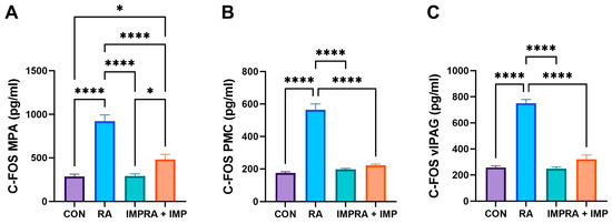 Analysis of c-Fos expression corroborated the findings observed in the biochemical parameters (Figure 4). RA administration significantly increased the levels of c-Fos in MPA (medial preoptic area), PMC (pontine micturition center) and vIPAG (ventrolateral periaqueductal gray) compared to all other groups. However, co-administration of imperatorin effectively reversed this effect in the case of PMC and vIPAG and showed a slightly smaller but still curative effect in the case of MPA (Figure 4).