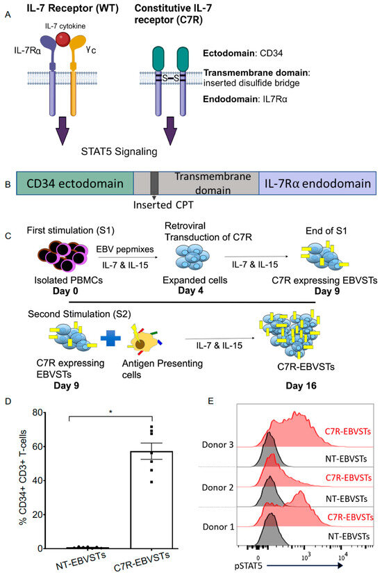 The C7R comprises a CD34-derived ectodomain, linked to the transmembrane and intracellular domains of the IL7Rα chain, carrying in the transmembrane domain that results in homodimerization as outlined in Figure 1A,B [33]. EBVSTs were generated from EBV seropositive donor peripheral blood mononuclear cells (PBMCs) by stimulation with overlapping EBV peptide libraries (15 amino acids overlapping by 11 amino acids) spanning the entire protein sequences of type-2 EBV latent antigens EBNA-1, LMP-1, and LMP-2 in the presence of IL-7 and IL-15. On day 4, the cells were transduced with a retroviral vector expressing the C7R and cultured in the continued presence of cytokines. On day 9 after the first stimulation (S1), the cells were re-stimulated (S2) using an irradiated antigen-presenting complex comprising pepmix-pulsed, autologous activated T-cells (ATCs) plus an HLA negative lymphoblastoid cell line (ULCL) that provides costimulatory signaling to T-cells [6] in the presence of IL-7 and IL-15 cytokines. On day 16, non-transduced (NT)- and C7R-EBVSTs were harvested and used in functional studies (Figure 1C).